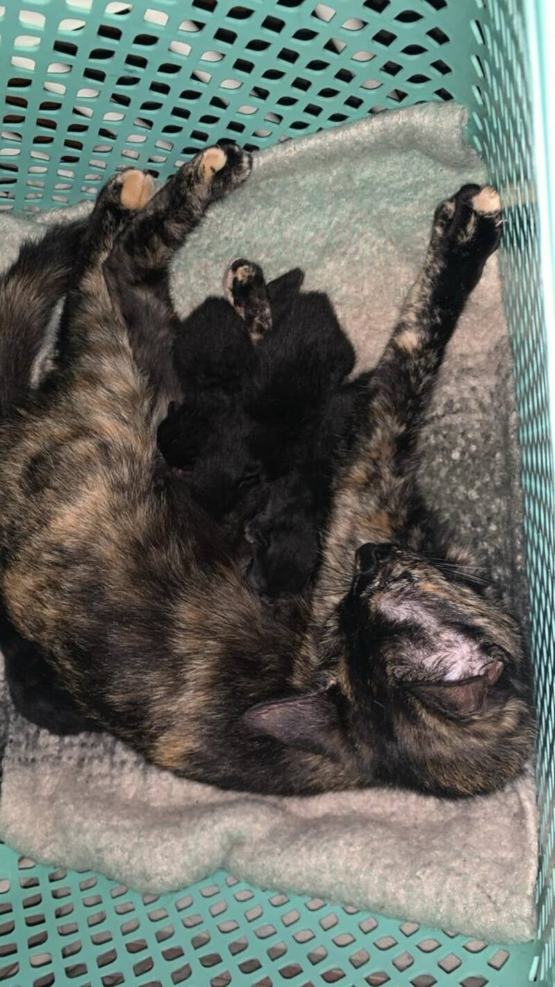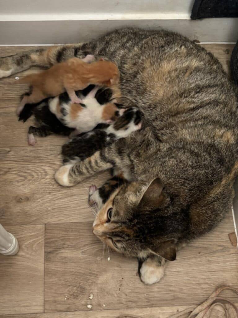 La chatte trappée sur le site de travaux des 2 autres chatonnes a mis bas avant le rdv de stérilisation