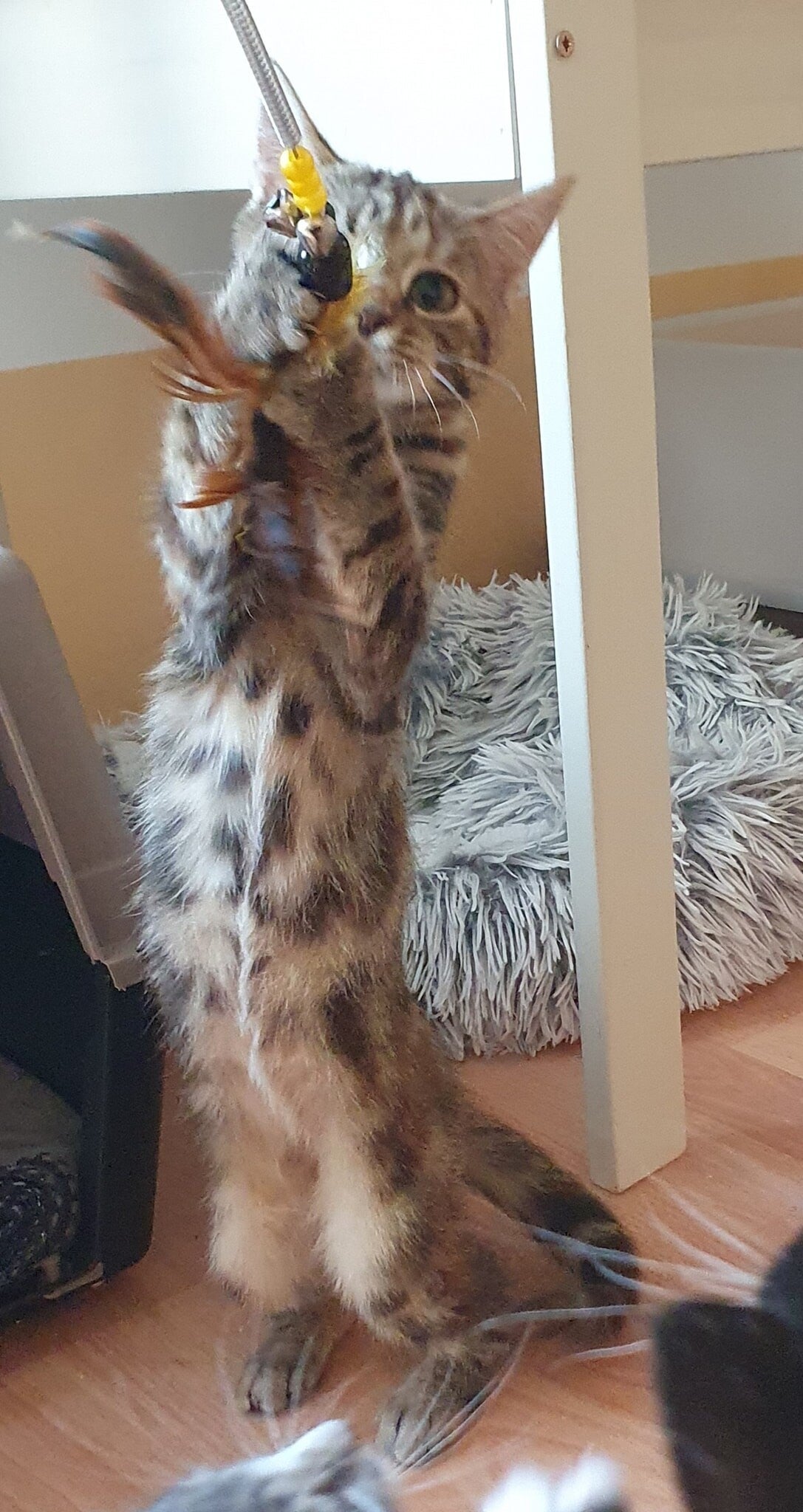 Wendy aime beaucoup jouer au plumeau et ne se lasse pas. Elle aime dormir au pied du lit et ronronne aux calins. Wendy est aussi tres gourmande et c'est comme le jeu un moyen de gagner sa confiance, car la demoiselle fuit quand elle ne connait pas, il lui faudra donc un peu de temps pour venir se fare caliner.